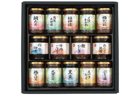 内容/鰹ひじき45g・たらこ昆布50g・のり佃煮125g 牛肉ごぼう60g・くきわかめ80g・鯛みそ105g・福神漬90g ぶどう豆105g・梅かつお90g・高菜大根漬65g・鶏そぼろ50g 大葉みそ105g・えのきだけ90g・黒豆105g